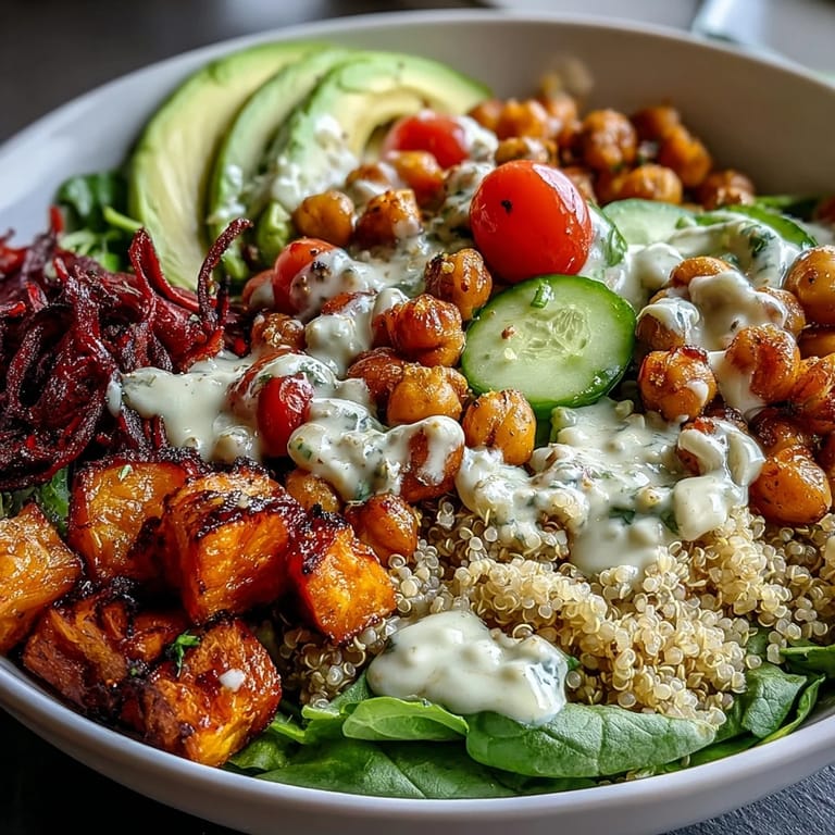 Pin it I discovered this bowl on a Tuesday afternoon when my fridge was looking pretty bare, and I had three friends texting about lunch plans. Instead of ordering yet another salad, I grabbed what I had on hand—some quinoa, a couple of sweet potatoes, and a can of chickpeas I'd been meaning to use—and suddenly this thing came together that felt both restaurant-worthy and completely honest. The magic happened when that garlic tahini dressing hit the warm grain base, and suddenly everyone was asking for the recipe instead of complaining about their midweek meals.