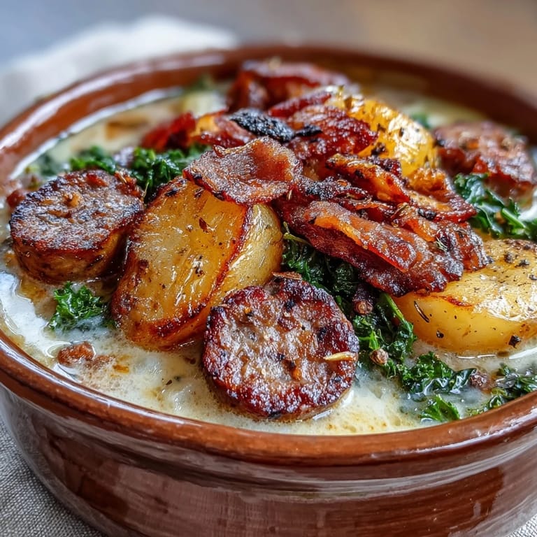 Pin it There's something about a bowl of Italian sausage soup that stops a conversation mid-sentence. My neighbor showed up one October evening with a pot of this, steam rising from under the lid, and suddenly the whole kitchen smelled like bacon and garlic—the kind of smell that makes you abandon whatever you were doing. She stood at my stove for five minutes explaining how simple it was, how the potatoes get creamy without cream soup, how the kale just softens into everything. I've made it at least twenty times since, and it never feels routine.
