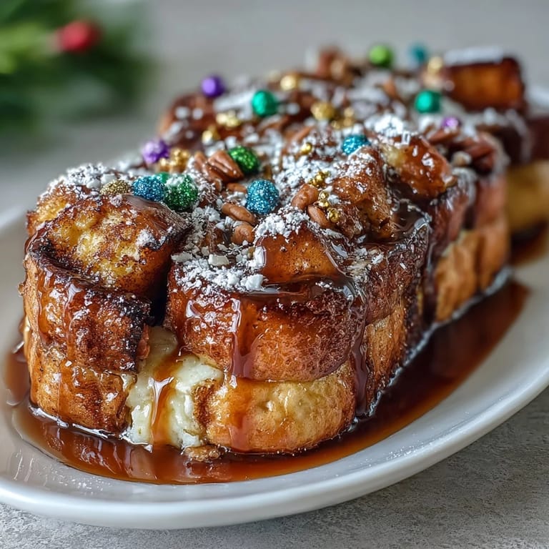 Serve this festive bake warm with fresh berries or whipped cream on the side. A dusting of additional powdered sugar adds elegance, while warm maple syrup appeals to traditional French toast lovers. For a complete Mardi Gras brunch spread, pair with crispy bacon, fresh fruit salad, and mimosas. Cut into generous squares and garnish each serving with extra colorful sprinkles for maximum celebration impact. Leftovers can be refrigerated and reheated in the oven for easy weekday breakfasts.